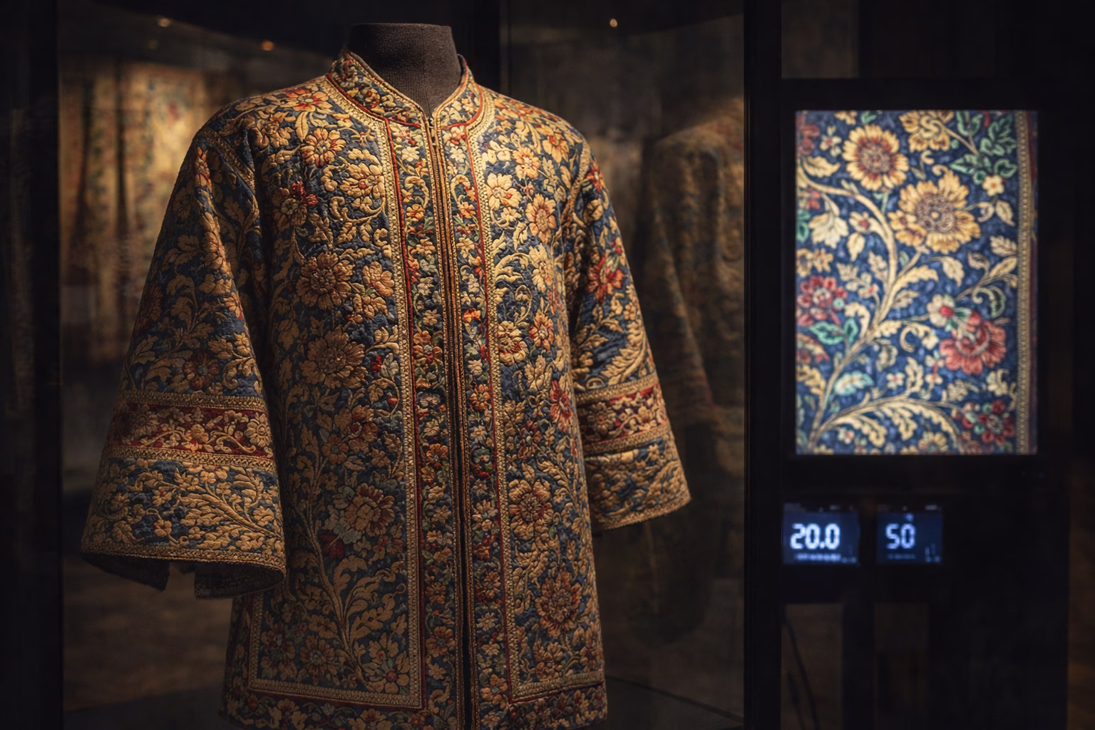 Tekstil je među najosetljivijim svedocima prošlosti. Dovoljno je previše svetla i boje počnu da blede, vlakna da slabe, a predmet da izgubi ono zbog čega je vredan. Zato muzeji svetlost tretiraju kao rizik, ne kao dekor: prigušeno osvetljenje, UV zaštita, stroga kontrola ekspozicije.