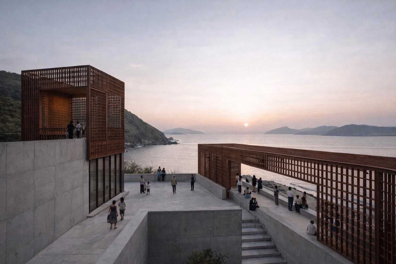 Prema dostupnom opisu projekta, dva paviljona stoje pod pravim uglom jedan prema drugom, sa betonskim zidovima koji usmeravaju kretanje i formiraju poluzatvoreno dvorište okrenuto ka obali. Jedan je viši i kompaktniji, bliži planini; drugi je niži i izdužen, položen uz liniju mora. Obe strukture obložene su korten rešetkama različite gustine, pa se kroz svetlo i senku čas čine lakšim, čas težim, gotovo kao da pejzaž i materijal pregovaraju o tome šta je prolazno, a šta trajno. Taj opis iz BAM PR arhive projekta možda najbolje objašnjava zašto je mala intervencija odjednom postala toliko vizuelno snažna.