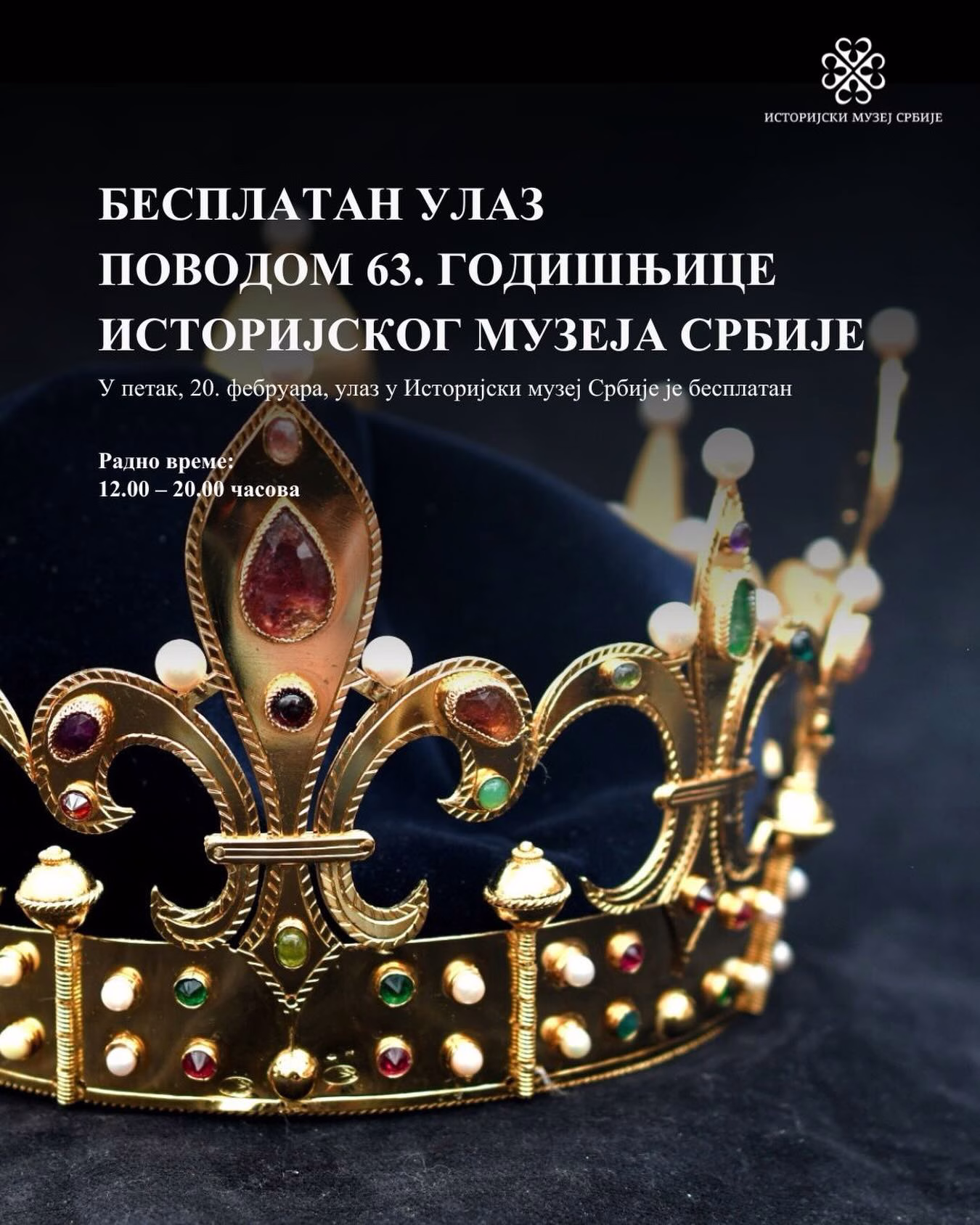 BEOGRAD – Povodom obeležavanja 63. godišnjice od osnivanja, Istorijski muzej Srbije otvara svoja vrata svim posetiocima uz besplatan ulaz u petak, 20. februara. Građani će moći da posete muzej na Trgu Nikole Pašića 11 u terminu od 12.00 do 20.00 časova i uživaju u bogatom kulturnom programu.