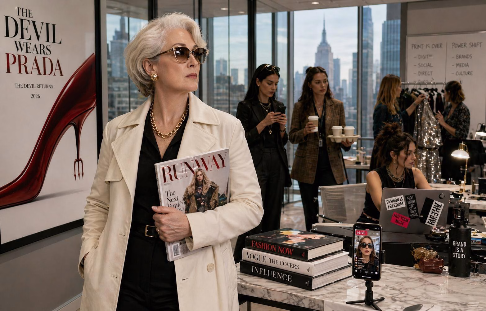 Tekst podseća da je londonska premijera održana u National Gallery, uz Meryl Streep u Pradi i prisustvo Donatele Versace, ali odmah zatim otvara mnogo važnije pitanje: više nije jasno ko danas u modi zapravo komanduje. U filmu magazin Runway mora da se suoči sa padom printa i prelaskom moći ka brendovima i digitalnim kanalima, a Guardian taj zaokret tumači kao vrlo realan odraz današnje situacije. Nekada su urednici bili ti koji odlučuju šta publika želi. Danas brendovi, influenseri i publika sami sve više pregovaraju o istom prostoru.