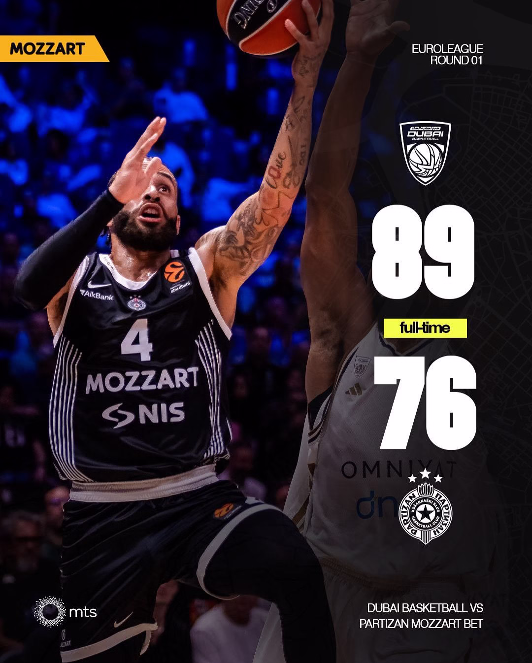 Košarkaši Partizana Mozzart Bet nisu uspeli da ostvare trijumf na evroligaškoj premijeri sezone 2025-26 u Dubaiju. Konačan rezultat meča u Koka-kola areni bio je 89:76 u korist domaćeg tima.