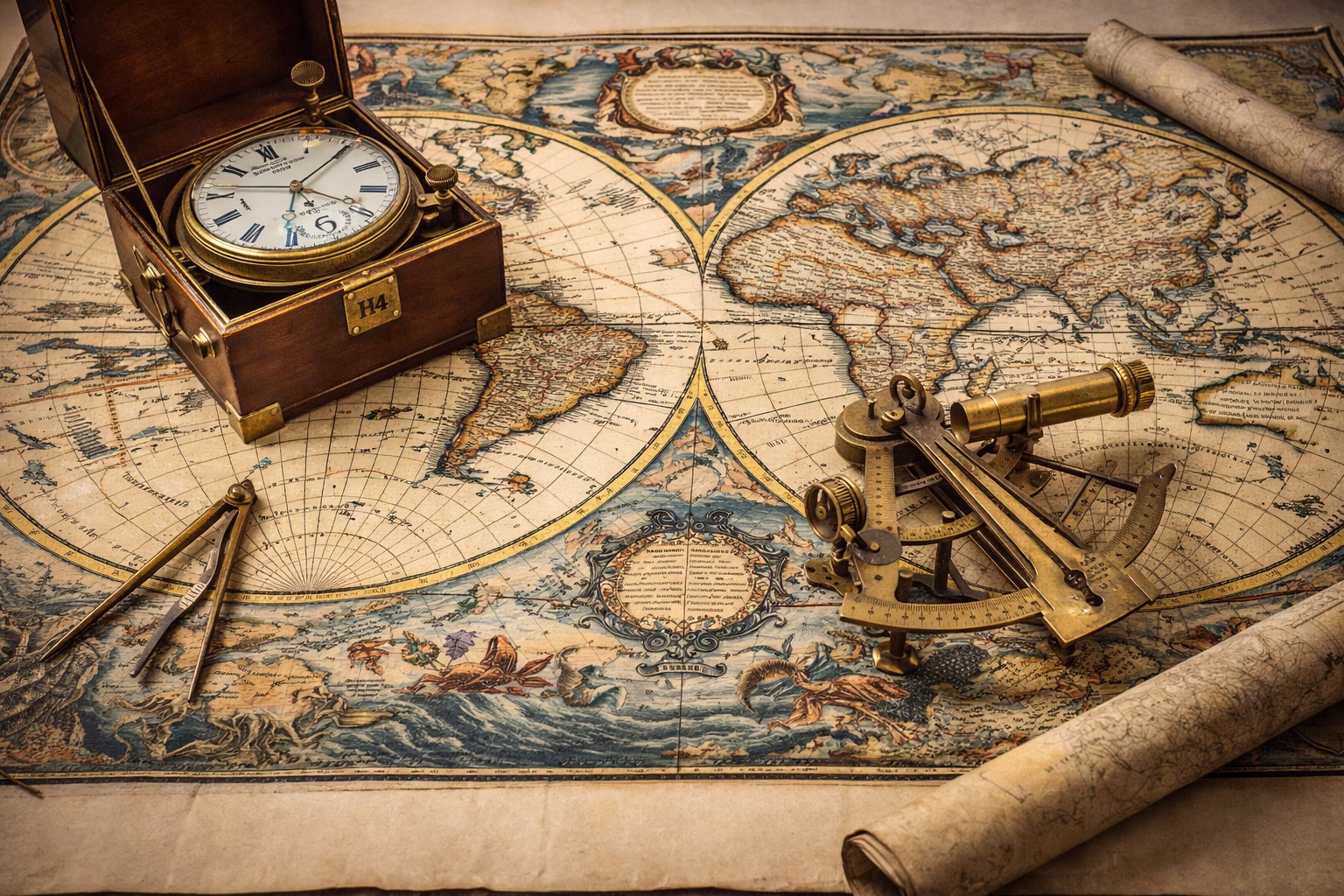 A onda je došao problem koji je gutao brodove: longitude. John Harrison je u 18. veku napravio hronometar H4 (rad započet 1755, dovršen 1759) koji je pomogao da se vreme na brodu meri dovoljno precizno da bi se izračunala pozicija istočno-zapadno. To je trenutak kada mapa prestaje da bude lep crtež i postaje alat koji spašava živote.
